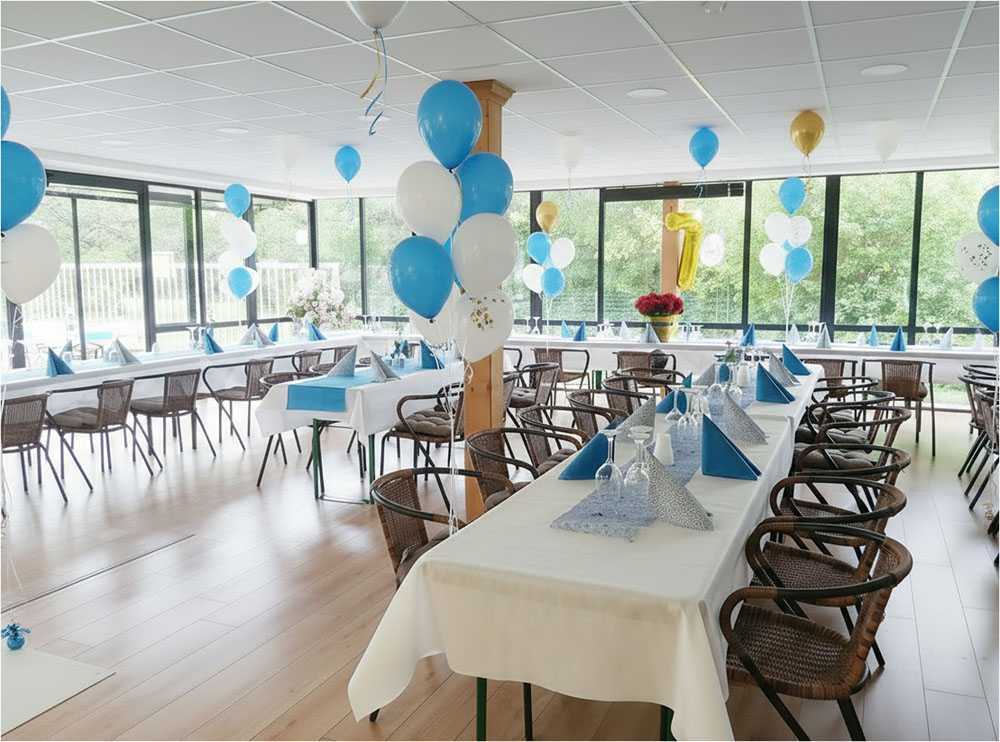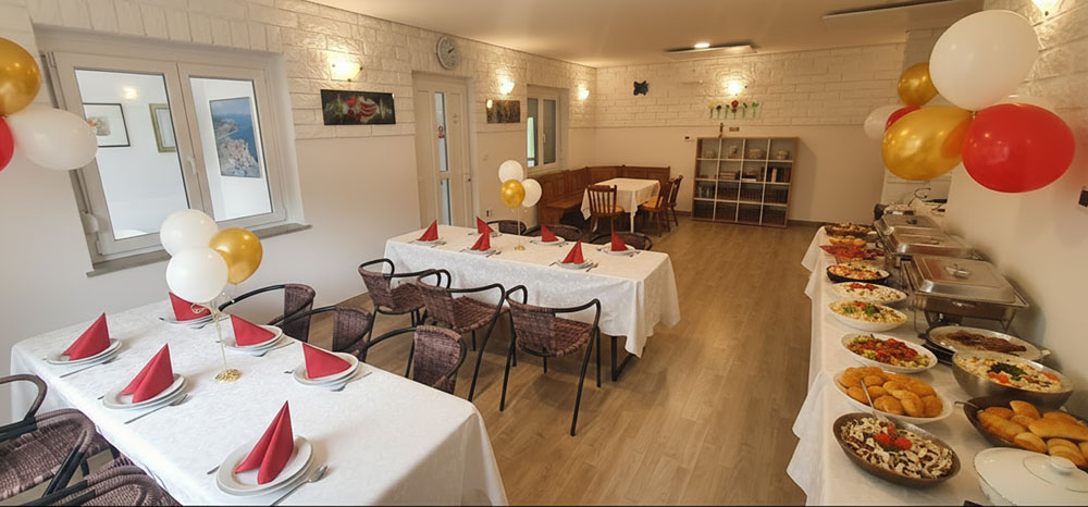 Prostor za delitev hrane, šank, plesišče, sanitarije, ogrevanje, parkirišče
