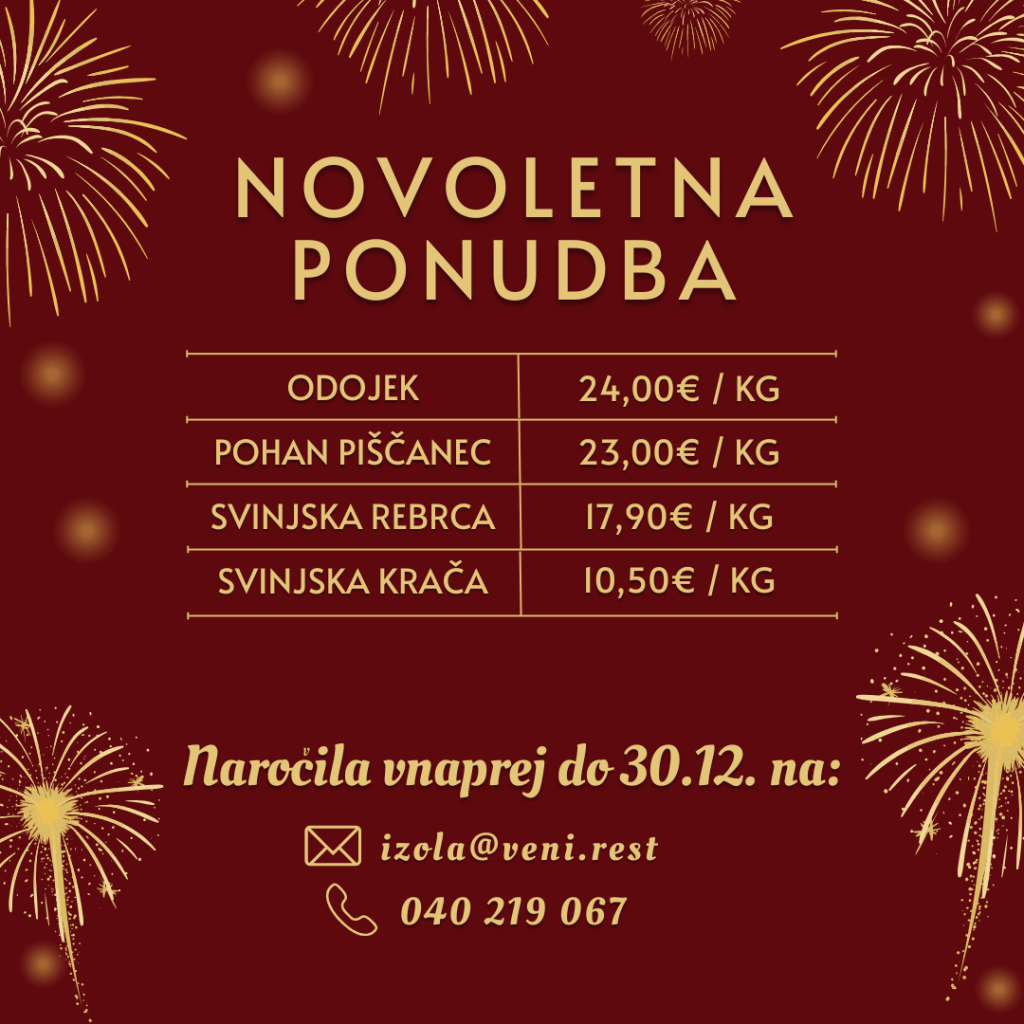 Obveščamo vas, da bosta obe lokaciji Veni zaprti za praznike (25. 12., 26. 12., 1. 1. in 2. 1.).